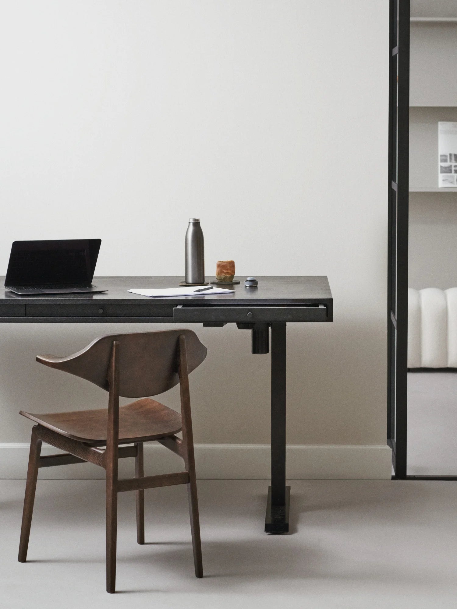 This desk is crafted with a sleek ash veneer tabletop, offering plenty of room to get things done, yet it doesn't dominate the room. The three built-in drawers keep essentials within easy reach, each adorned with knobs reminiscent of vintage car radio buttons—a delightful nod to the past. Plus, with a clever hidden compartment for a power bank, it's perfect for today’s tech-savvy users, allowing you to charge your devices without cluttering up your work area. A discreet cable management system helps keep cords tidy and your work zone clean.